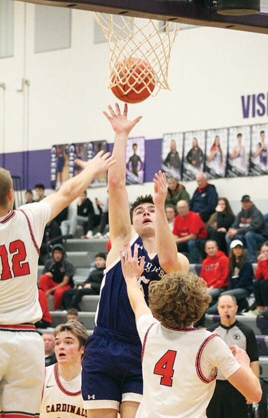 Staff photo by Travis Rosenau New Ulm’s Zach Hubbard puts up a shot in the paint over a pair of Redwood Valley defenders on Monday night in a Big South Conference crossover boys basketball game at New Ulm High School.