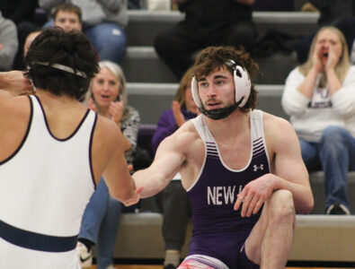 Haynes got a quick takedown in the first 30 seconds of his match and was able to turn it into a pin in 42 seconds, giving his team a 32-17 lead in what was becoming a tight dual. After showing off the New Ulm on his singlet and shaking his opponent’s hand, Haynes let out a yell in celebration as he joined his teammates.