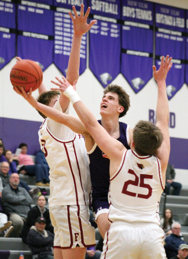NEW ULM — The New Ulm Eagles managed to keep the red-hot Fairmont Cardinals in check throughout much of Friday night’s Big South Conference boys basketball crossover game, but too many empty possessions and turnovers had the Eagles on the wrong side of the things in the end.