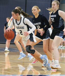 A Steffl bucket gave the Cougars an early 6-3 lead, but Zahrt scored inside to kick off a 9-0 MVL run to lead 12-6. Violet Hammer had a pair of free throws after Zahrt’s bucket, while Avery Freier hit a 3 and Violet Hammer had a jumper to complete the run and force a Cougars timeout with 14:26 still to play in the half.