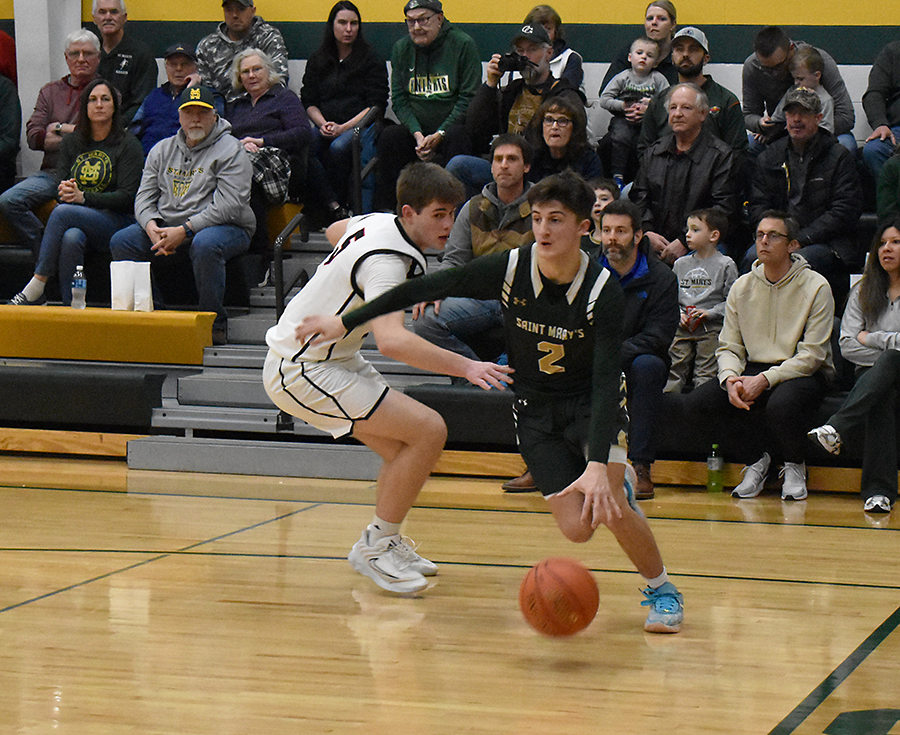 - Staff photo by Ari Selvey Sleepy Eye St. Marys’ Adam Steffensmeier (2) drives the baseline against Gibbon-Fairfax-Winthrop’s Matthew Lee (5) during a Tomahawk Division boys basketball game at St. Mary’s High School on Monday.