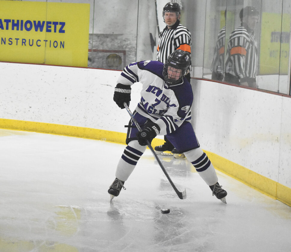 Exactly two minutes later, New Ulm’s Brody Nordby responded, as tic-tack-toe passes from Carson Uecker and Carsten Haala set him up for a goal to give the Eagles the lead once more.