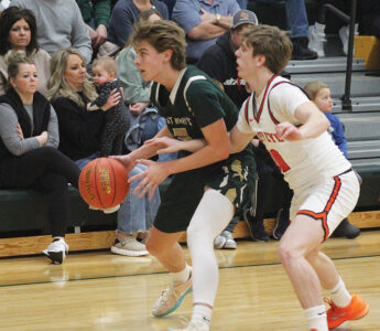 Staff photo by Travis Rosenau Sleepy Eye St. Marys’ Eli Christensen dribbles the ball while guarded by Sleepy Eye’s Riley Voigt during a Tomahawk Division boys basketball game Friday night at St. Mary’s High School.