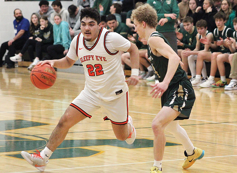 - Staff photo by Travis Rosenau Sleepy Eye’s Eric Lozano dribbles the ball to the lane while guarded by Sleepy Eye St. Marys’ Tyler Mathiowetz during a Tomahawk Division boys basketball game Friday at St. Mary’s High School.