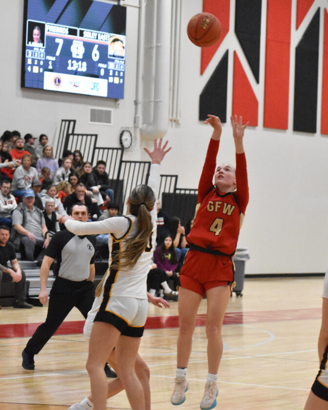 - Staff photo by Ari Selvey Gibbon-Fairfax-Winthrop’s Kinley Bruns (4) puts up a shot over Sibley East’s Bridget Biron (10) during a nonconference girls basketball game at GFW High School in Gibbon on Monday.