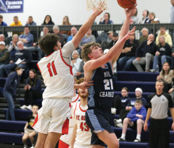 - Staff photo by Travis Rosenau Minnesota Valley Lutheran’s Luke Merseth scores on a layup during a South Central Conference boys basketball game against St. Clair on Tuesday at MVL High School.