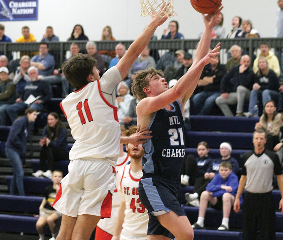 Staff photo by Travis Rosenau Minnesota Valley Lutheran’s Luke Merseth scores on a layup during a South Central Conference boys basketball game against St. Clair on Tuesday at MVL High School.