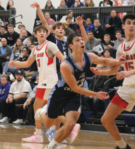 - Staff photo by Travis Rosenau Minnesota Valley Lutheran’s Pierson Brau, back-center, watches a 3 of his drop in late during a South Central Conference boys basketball game against St. Clair on Tuesday at MVL High School.