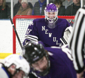 - Staff photo by Travis Rosenau New Ulm goalie Blaine Arneson locks in during the third period before a faceoff in a Section 3A boys hockey playoff game against Minnesota River on Thursday in Le Sueur.