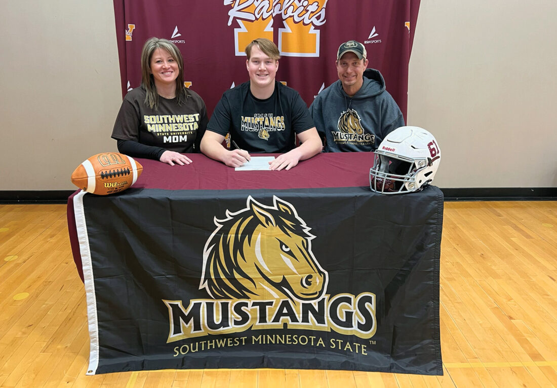 Submitted photo/information On Feb. 4, Joshua Timm, a senior at Wabasso High School, signed with Southwest Minnesota State University Mustangs to play football. Timm has been involved in football, basketball, FFA, wrestling and track. His parents are Brian and Jen Timm of Sanborn.