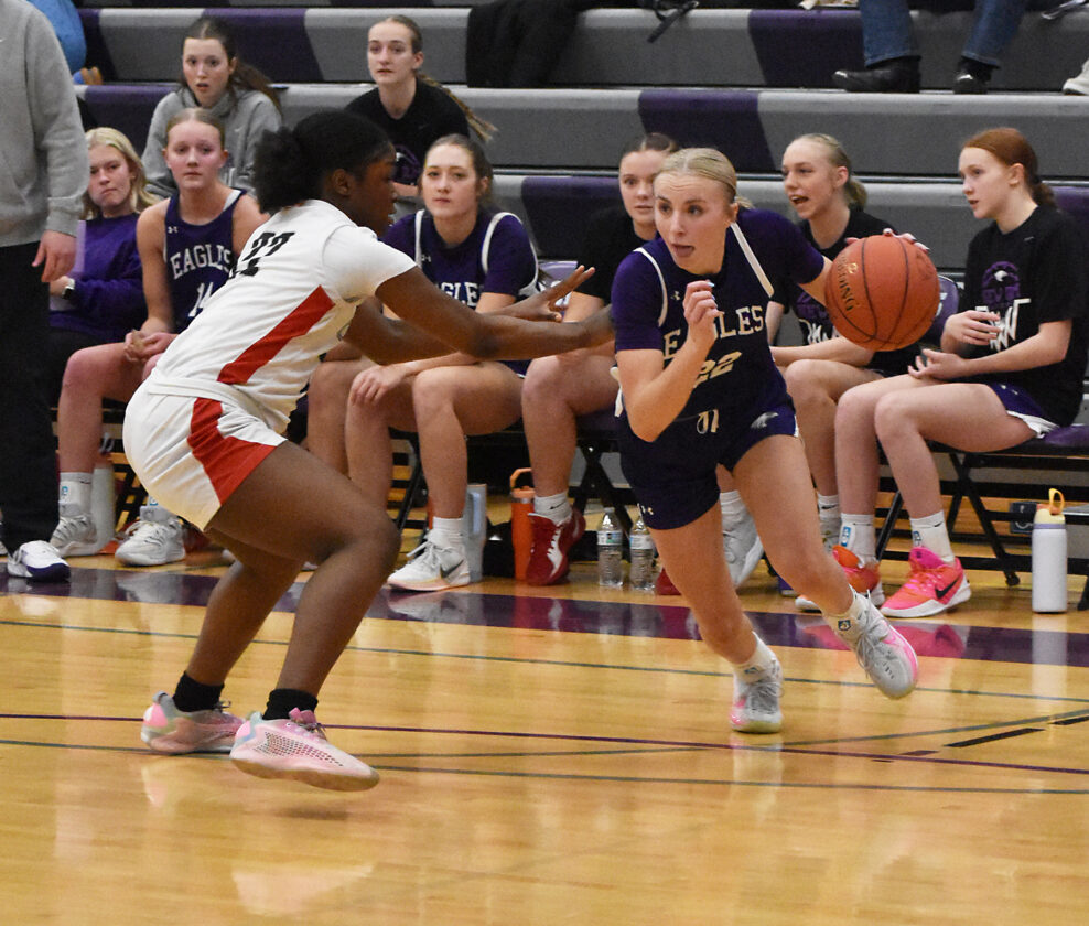 - Staff photo by Ari Selvey New Ulm’s Riley Wilson works against a defender during a nonconference girls basketball game against Coon Rapids Friday at New Ulm High School.