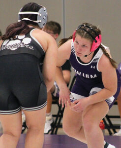 File photo by Travis Rosenau New Ulm Area’s Ellie Dake, right, wrestles a girls match prior to the Eagles’ home dual against Scott West on Dec. 11, 2025, at New Ulm High School. Dake will compete in the girls state tournament beginning Thursday.