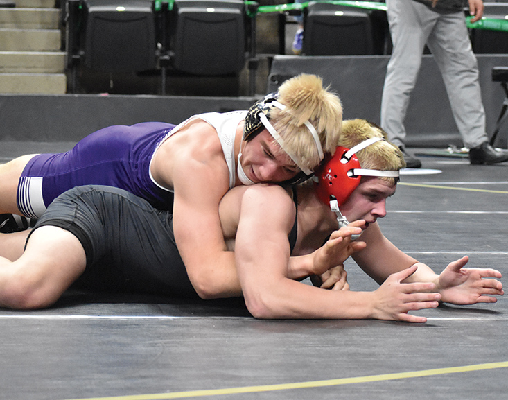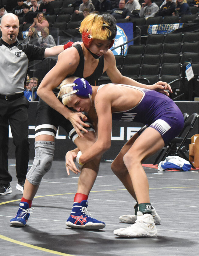 - Staff photo by Ari Selvey New Ulm Area’s Elijah Rieser grapples with Simley’s Drezden Short at 139 during the Class AA State Team Wrestling Championship at Grand Casino Arena on Thursday.