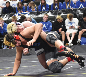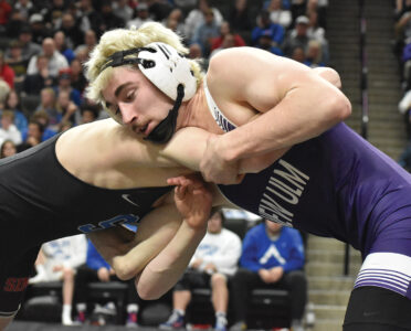 Staff photo by Ari Selvey New Ulm Area’s Candon Briggs wrestles with Simley’s Preston Harms at 160 during the Class AA State Team Wrestling Championship Thursday at Grand Casino Arena.