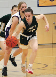 - Staff photo by Travis Rosenau Sleepy Eye St. Marys’ Kiara Murphy chases down a loose ball at midcourt during the second half of Thursday’s Section 2A girls basketball quarterfinals game against Granada-Huntley-East Chain/Truman/Martin Luther at St. Peter High School.