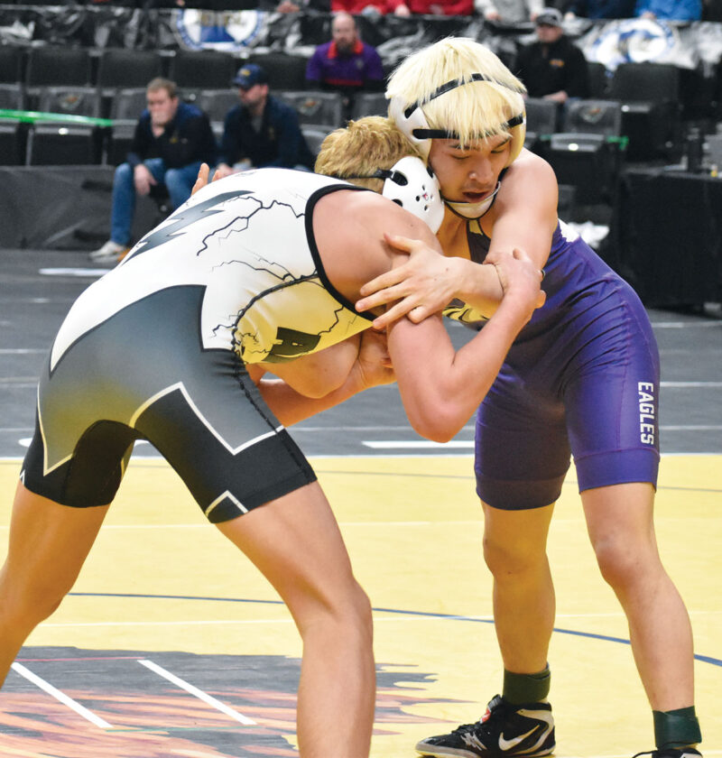 - Staff photo by Ari Selvey New Ulm Area’s Regan Johnson grapples with Cannon Falls’ Owen Parish during the State Individual Wrestling Tournament on Friday.