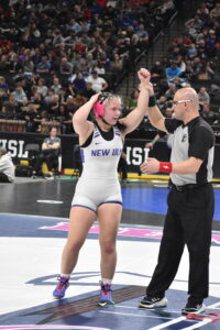 - Staff photo by Ari Selvey New Ulm Area’s Ellie Dake wins the third-place match of the State Individual Wrestling Tournament at 170 Saturday at Grand Casino Arena.