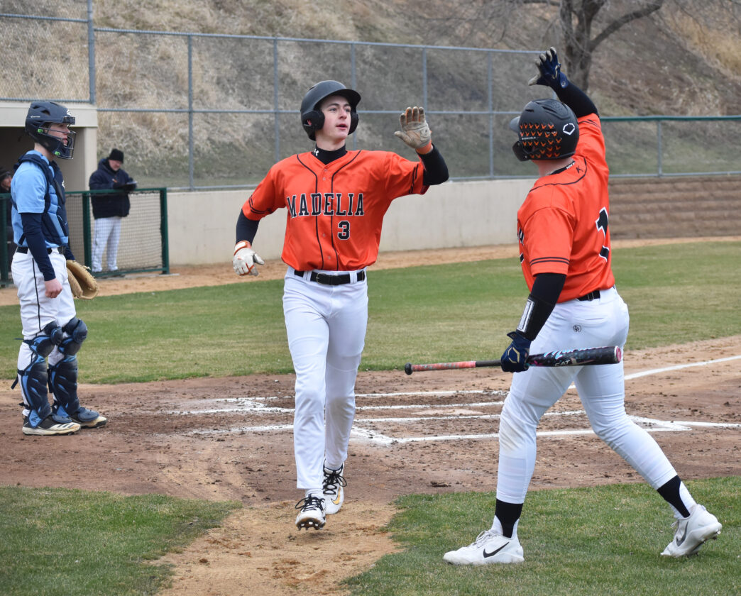 - Staff photo by Ari Selvey Madelia’s Tate Becker (3) high-fives teammate Tony Zaleski (7) after scoring a run in a nonconference baseball game against Minnesota Valley Lutheran Thursday at Mueller Park.