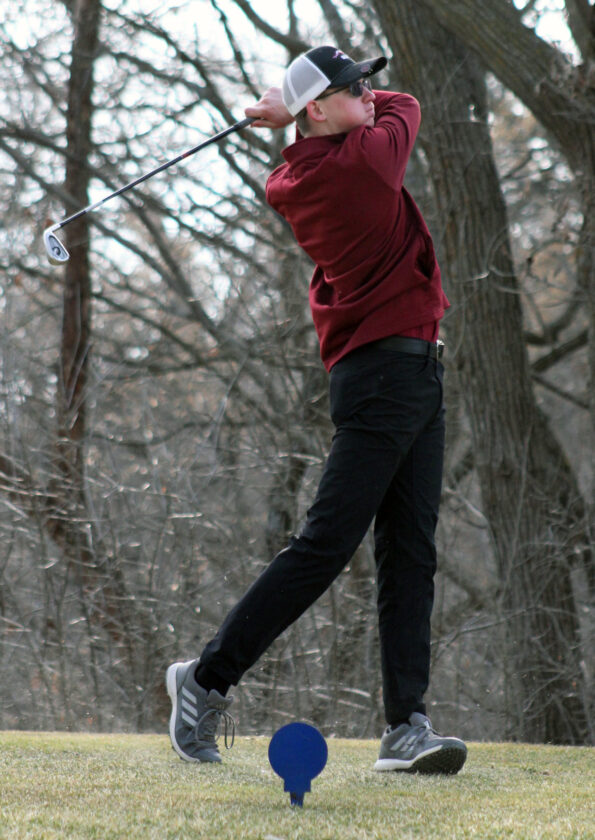 Staff photo by Travis Rosenau New Ulm Cathedral’s Carter Wilson tees off during a Tomahawk Division golf meet against Cedar Mountain at the New Ulm County Club on Tuesday.
