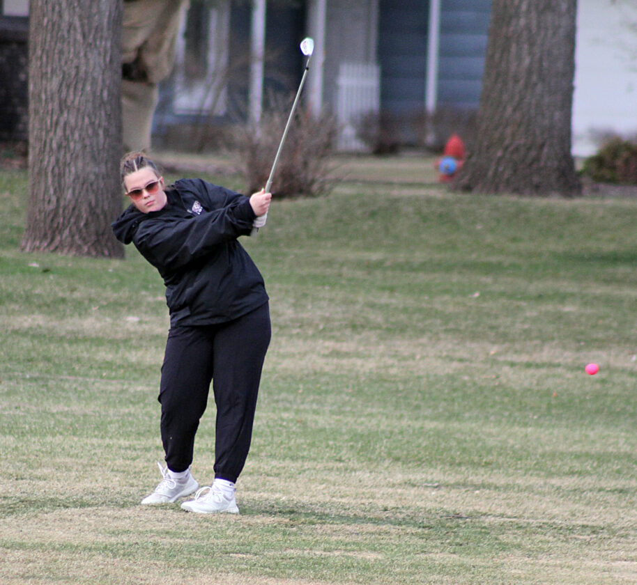 - Staff photo by Travis Rosenau New Ulm Cathedral’s Megan Fingland watches a shot of hers during a Tomahawk Division golf meet against Cedar Mountain at the New Ulm County Club on Tuesday.
