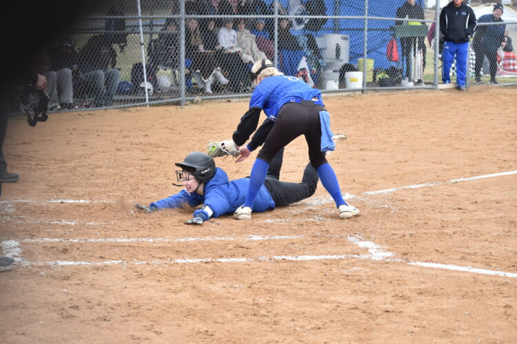Staff photo by Ari Selvey Nicollet's Chloe Kachelmeier slides for home during a nonconference softball game against Buffalo Lake-Hector-Stewart on Saturday at Nicollet High School.