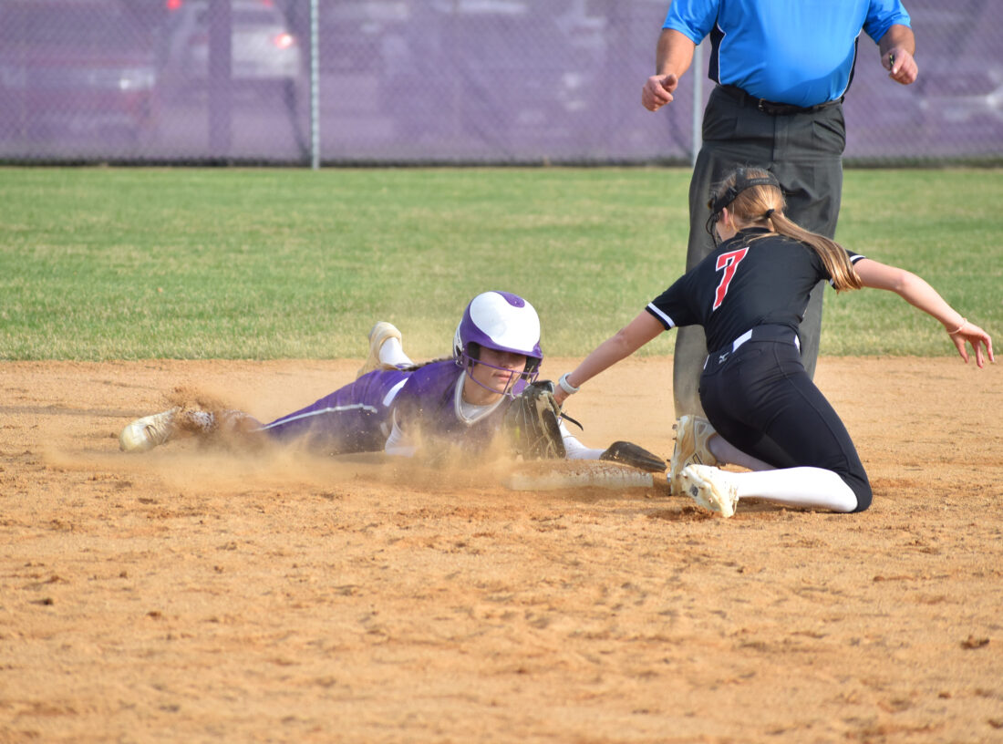 - Staff photo by Ari Selvey New Ulm’s Gracie Baker evades the tag from Belle Plaine’s Cece Schultz (7) to steal second during a Big South Conference softball game Tuesday at New Ulm High School.