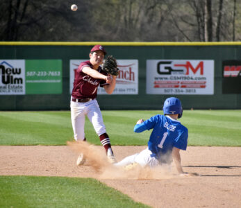 - Staff photo by Ari Selvey New Ulm Cathedral’s Alex Portner throws over to first base after getting the out at second during a Tomahawk Division baseball game against Buffalo Lake-Hector-Stewart Thursday at Mueller Park.