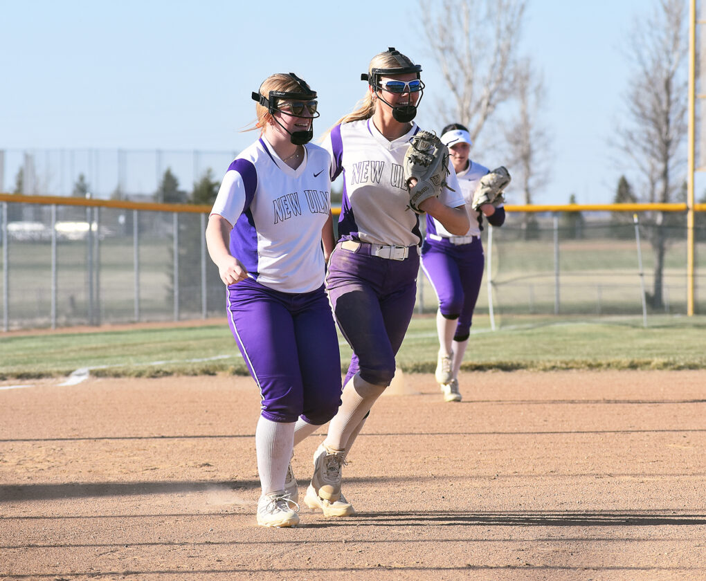 Photo by Jake McNeill/Marshall Independent New Ulm third baseman Eliana Cariveau greets shortstop Lauren Schmiesing following an out during a Big South Conference softball game in Marshall.
