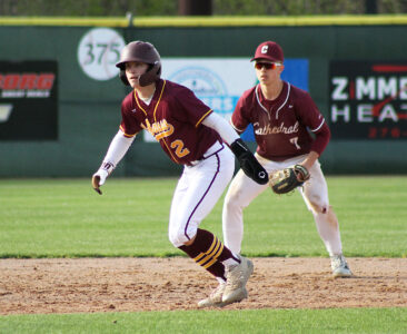 Staff photo by Travis Rosenau Wabasso’s Zach Skoblik leads off second in front of New Ulm Cathedral shortstop Evan Blekestad during the first game of a Tomahawk Division baseball doubleheader on Tuesday at Mueller Park.