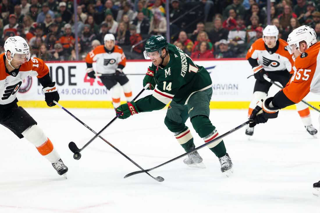 FILE – Minnesota Wild center Joel Eriksson Ek (14) battles for the puck against Philadelphia Flyers right wing Garnet Hathaway (19) and defenseman Rasmus Ristolainen (55) during the first period of an NHL hockey game Thursday, March 12, 2026, in St. Paul, Minn. (AP Photo/Ellen Schmidt)