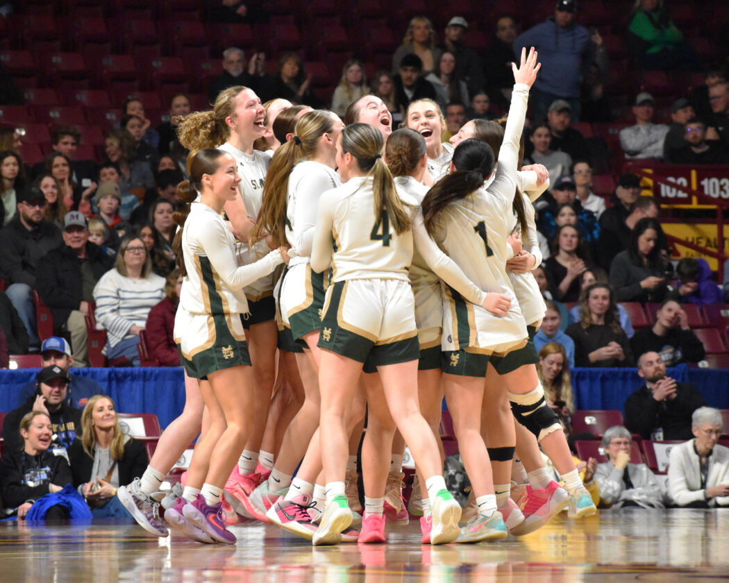 Staff photo by Ari Selvey The Sleepy Eye St. Mary's girls basketball team celebrates its win over Mountain Iron-Buhl in the Class A State Girls Basketball Tournament championship Saturday at Williams Arena.