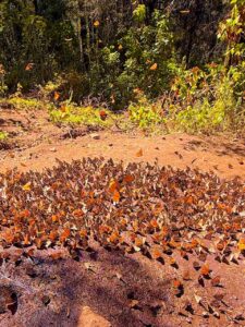 A group of monarch butterflies puddle together on the ground at the El Rosario monarch butterfly sanctuary. Photo by Deb Steinberg