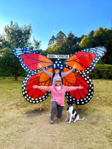- Deb Steinberg (back) and Julie Gartner (front) pose in front of a monarch butterfly sculpture outside of the Sierra Chincua sanctuary in Central Mexico. Photo provided by Deb Steinberg